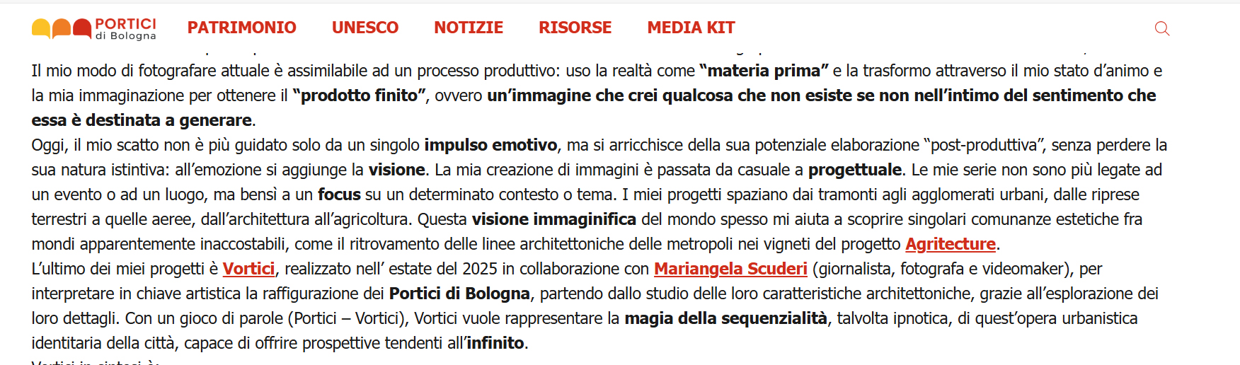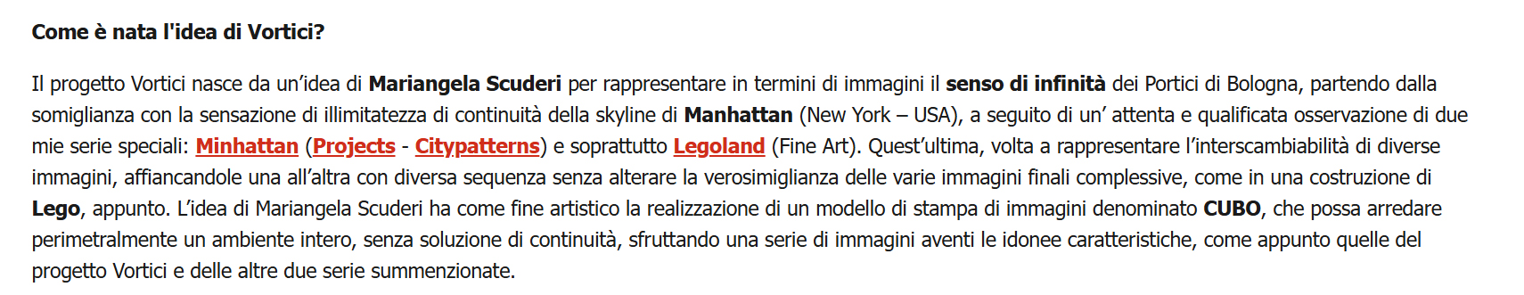 Mariangela Scuderi, professionista poliedrica nel campo della comunicazione visiva, ha fornito la visione concettuale che ha generato il progetto Vortici. La sua idea nasce da un'osservazione acuta: la capacità dei Portici di Bologna di evocare, proprio come Manhattan, una sensazione di illimitatezza e continuità infinita.